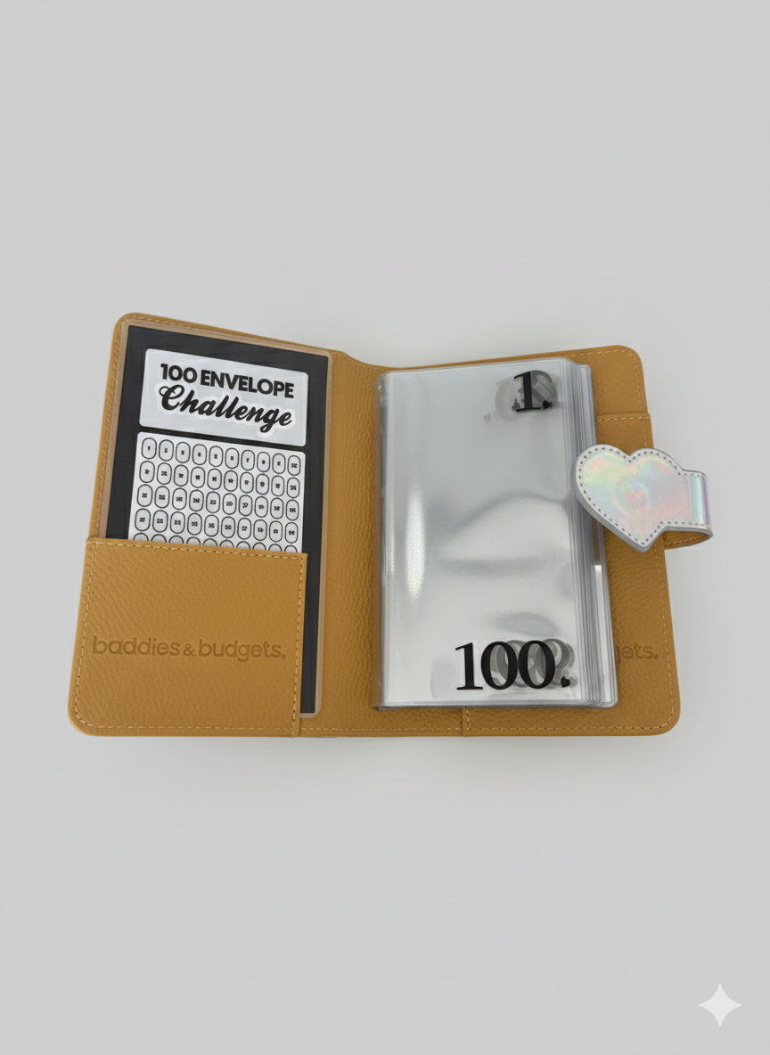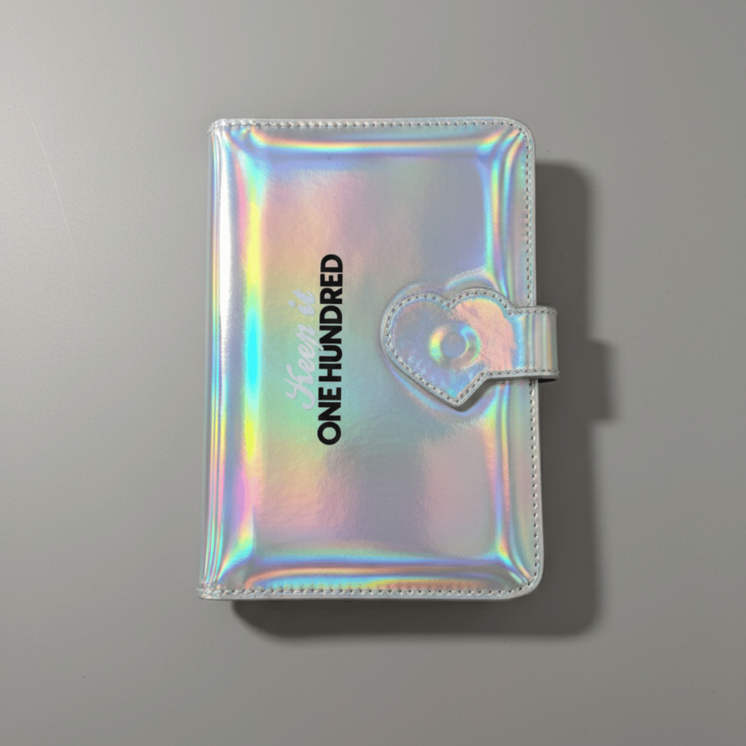 A holographic "Keep it One Hundred" binder, 100 clear numbered envelope sleeves, a 100 Envelope Challenge tracking insert, a heart clasp closure, and a tan interior with the Baddies & Budgets branding you love.